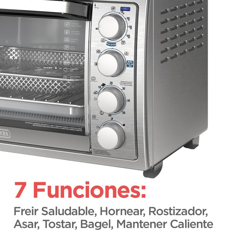• 7 Funciones: Freir sin Aceite, Hornear, Asar, Tostar, Bagel, Rostizar y Mantener Calientes tus Alimentos