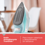 ¡Ligera y fácil de manejar! La Plancha TrueGlide™ cuenta con suela antiadherente de mayor cobertura, una fuerte ráfaga de vapor y Tecnología SmartSteam™, que automáticamente regula el nivel de vapor basado en tela para agilizar los controles y tomar las conjeturas de planchado. También cuenta con tanque de agua transparente con clip integrado para evitar goteos y mango Comfort Grip™ para mayor comodidad a la hora del planchar. Simplemente desenvuelve y enchufa el cable giratorio de 360˚ grados para asegurar un mejor planchado.